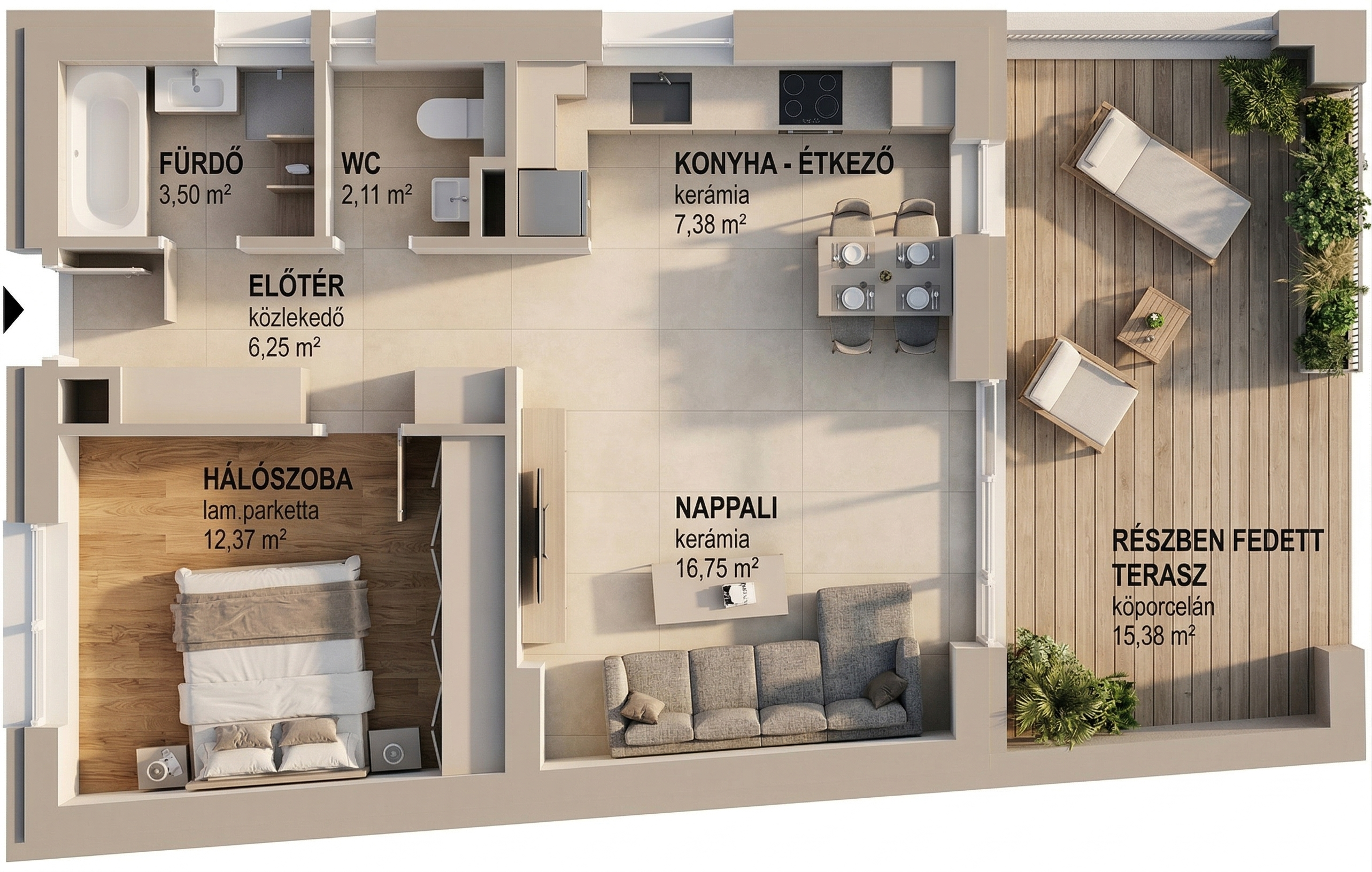 - 49 nm-es nappali plusz 1 hálószoba