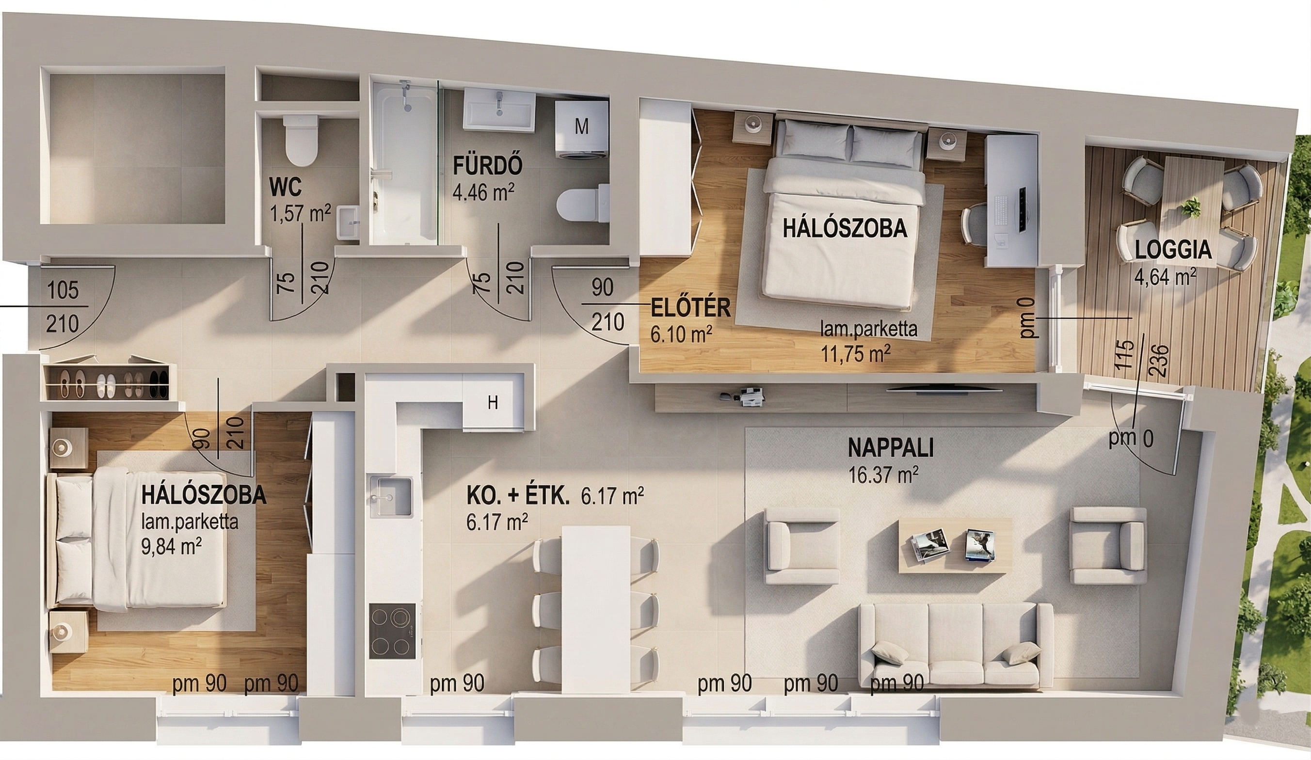 - 64 nm-es nappali plusz 2 hálószoba